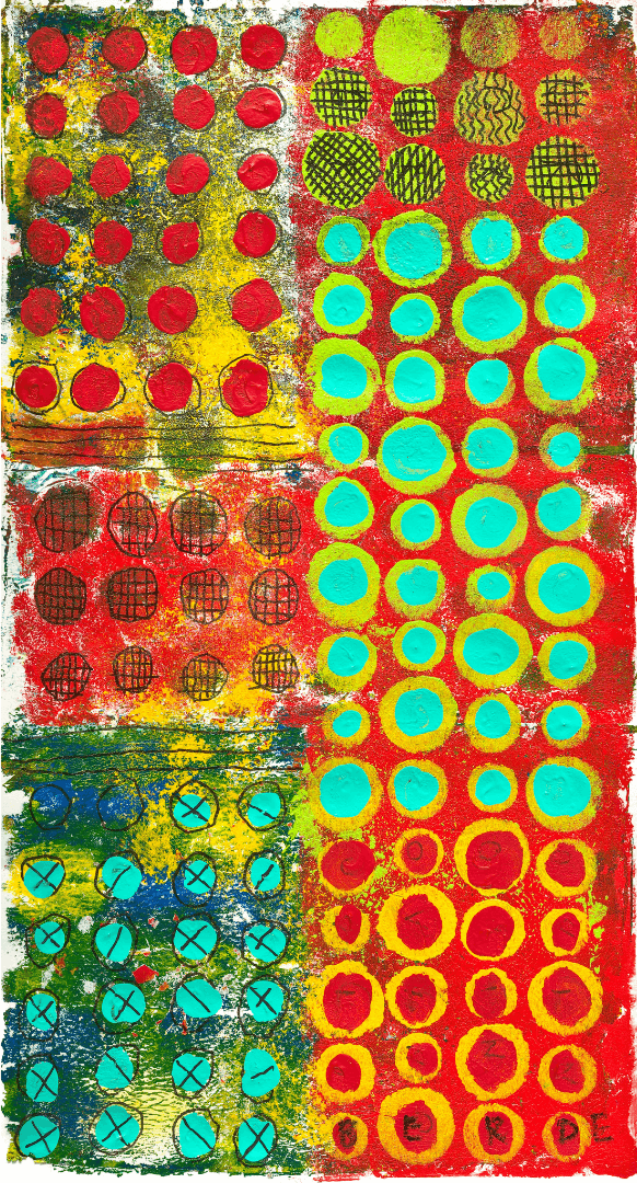 This work combines using acrylic paint, hand painted papers, and free-form line drawings. These pieces represent many hours of exploration in my studio.